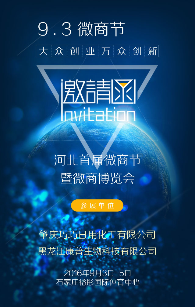 巧巧日化將攜手康普生物科技有限公司于2016年9月3日參加河北微商節(jié),歡迎廣大新老朋友屆時(shí)蒞臨指導(dǎo)。查看我們的產(chǎn)品,并與我們進(jìn)行面對(duì)面的深入交流!